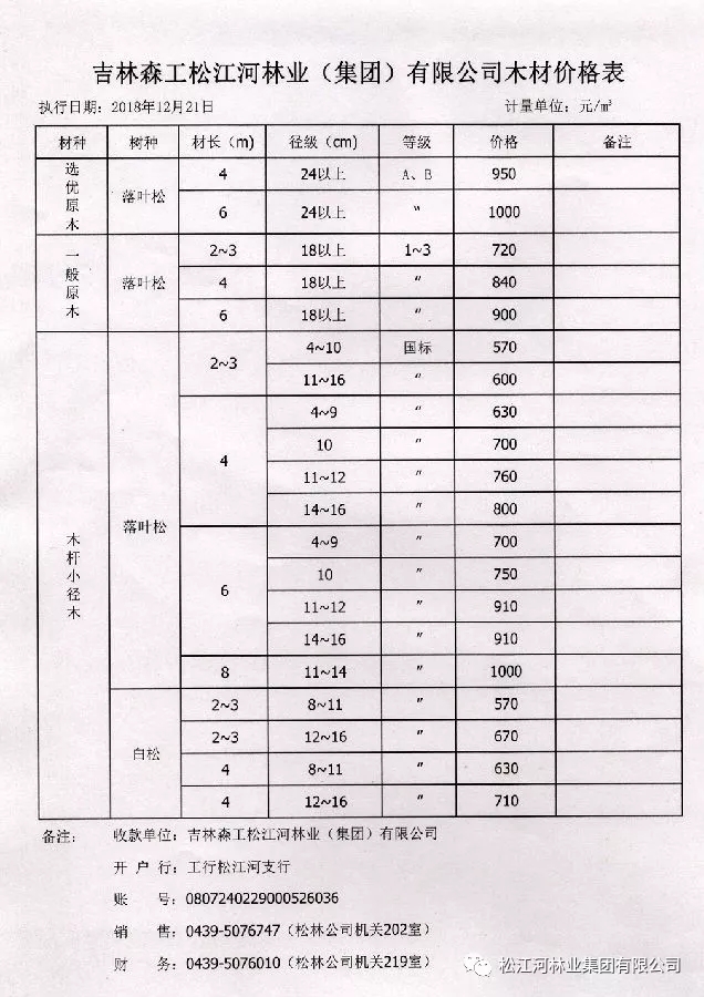 松林会社の木材価格表